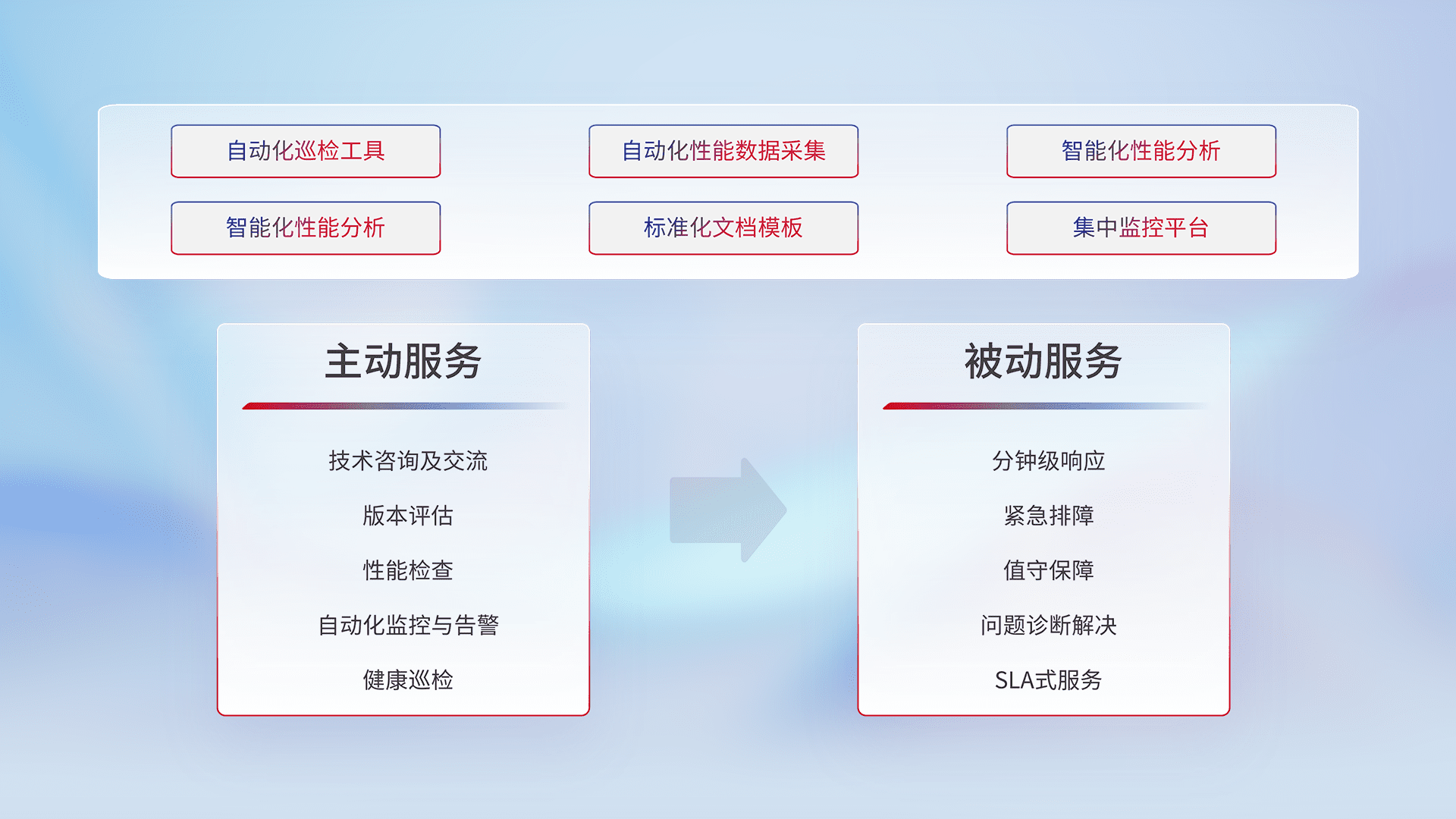 智能化工具和标准化文档,,保障服务质量,,,提供主动服务(包含技术咨询、、、、版本评估、、、性能检查、、、、自动化监控与告警、、、健康巡检)和被动服务包含(分钟级响应、、、、紧急排障、、值守保障、、、、问题诊断解决、、SLA服务)。。。