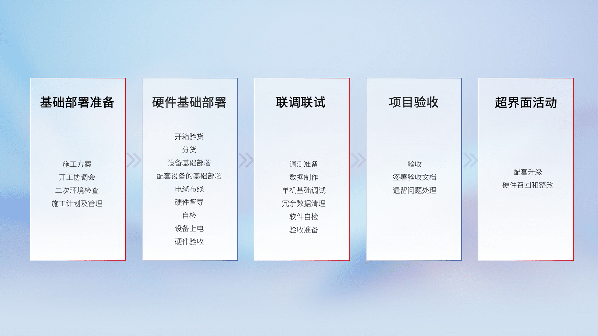 从基础部署准备、、硬件基础部署、、、、联调联试、、项目验收、、、、越界面活动的全过程可追溯,,,,保证施工质量和进度。。。
